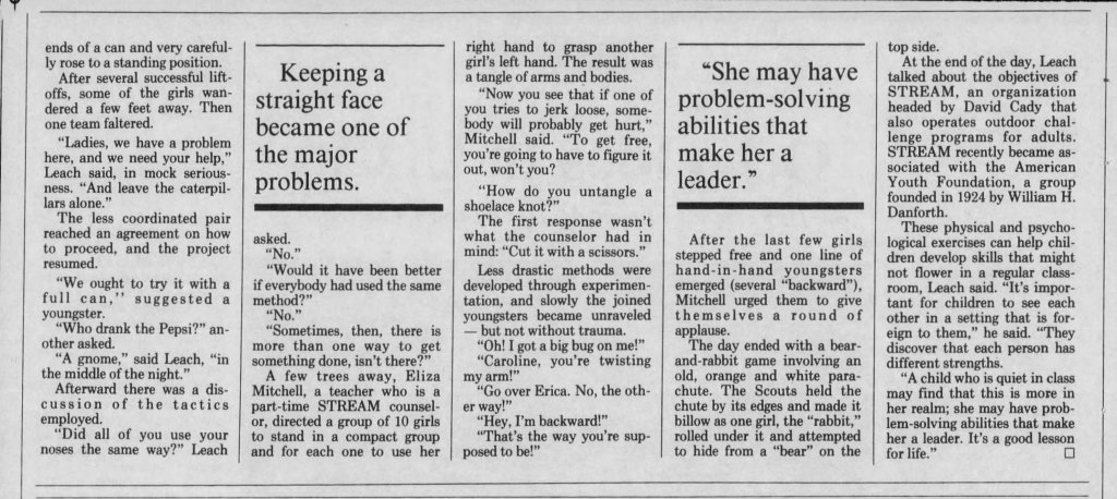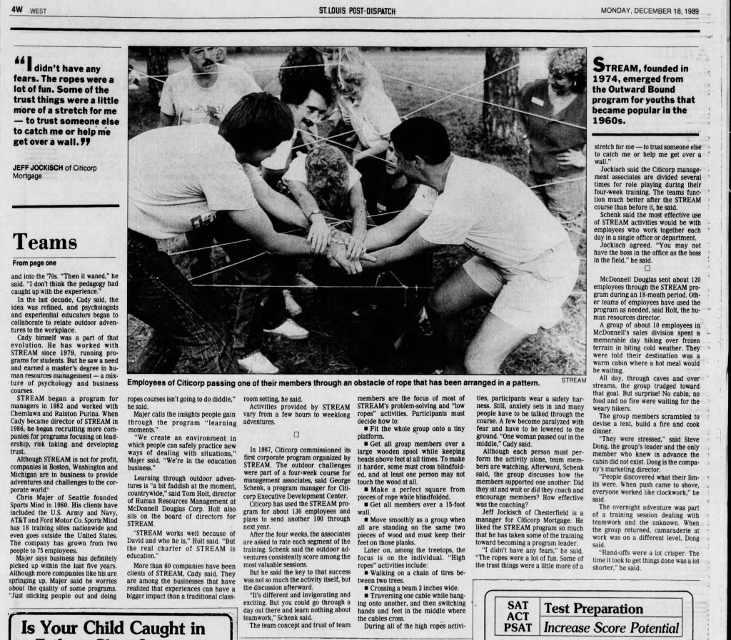 STREAM continued to offer teacher training programs encouraging the use of experiential learning to supplement what was being taught in the classroom. In 1979, Hank left STREAM to start Student Leadership/ Experiential Adventure Programs (SL/EAP) with the St. Louis Public Schools. Bruce Bailey became Executive Director of STREAM, and started doing professional development programs, and certification courses like ropes course, rock/climbing and rappelling, caving, vertical rigging and rescue. Corporate team building, FBI search and rescue training became funding streams along with week long adventure based trips for Priory, Principia, Country Day School, and shorter duration programs with the YMCA and scouts.