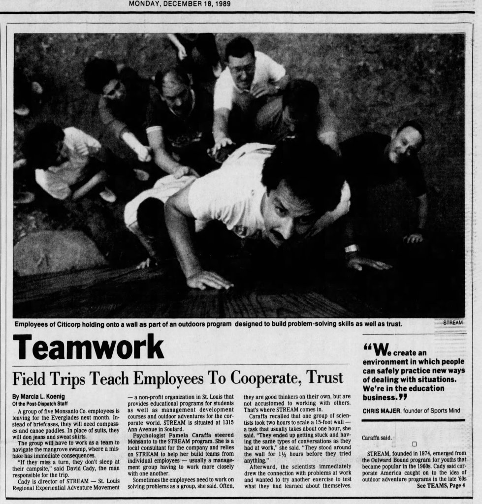 In 1985, I was teaching at Forsyth School and leading outdoor adventure programming during the school year at Forsyth and working contractually for STREAM on weekends and during the summer. As part of my coursework at Washington University (working on my Masters Degree), I asked Bruce to do an organization diagnosis to help him improve delivery of programming and because I saw many frustrations as a contractual staff employee. I interviewed Bruce, staff and board members and wrote a paper for my class. later Bill Comfort approached me about taking the role of Executive Director since Bruce had accepted a position as Director of CORO.