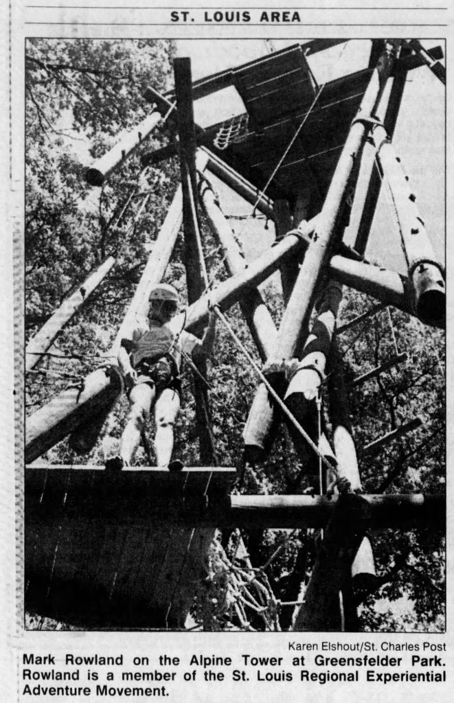 If I knew then what I know now I never would have taken the position. Bill Comfort held my hand and said, “Do not worry about the bill collectors, refer them to me, just get in there and set up programs and fill the calendar.” So that is what we did. I was the lone staff member, along with Hank’s mother in law-Hilda, as part time bookkeeper. So Spring 1986, the month Nick Cady was born I took the job. It was crazy but I sold programs, staffed them with contractual folks and Bill and Hilda paid the bills. After that first year, Bob MacArthur had taken the job as Executive Director of the American Youth Foundation. He was one of several people with whom I interviewed and got to know as a part of my outreach as Director of STREAM. He wanted an operational arm of the AYF in STL to complement the camps in Michigan and New Hampshire. He liked the focus I had brought to STREAM to continue educational programs (YMCA, Scouts, school groups), staff certification and corporate training. By having a year round funding source we were able to stabilize STREAM, hire staff and expand programming. The budget grew from 50K year 1 to 500K, doing 5,000 program days when I left in 1993. We built additional programming sites (ropes course- Camp Sabra, Carondelet Park, Coldwater Creek, Camp Wyman, Greensfelder-Alpine Tower) reached out to agencies to develop sites for rock climbing/rappelling (Meramec State Park, Rockwoods Reservation, Urban Adventure Center, Greensfelder County Park,…).