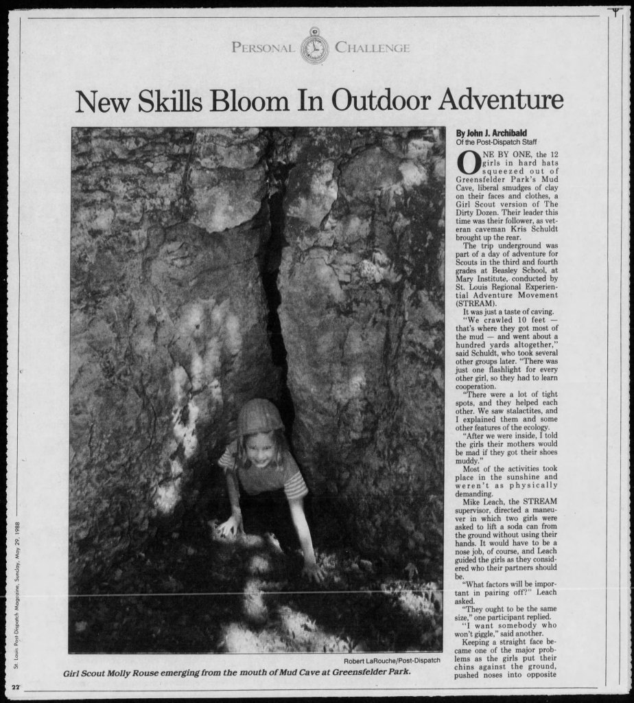 There were several other programs around this time, Darryl Hall and Parkway Youth Center (John Siemers), who primarily served youth who were having difficulty and did “Hoods in the Woods” programming. Darryl Hall ended after a death or severe injury, and Parkway Youth Center became the Progressive Youth Center around 1986 when STREAM provided outdoor adventure programming. Charlie Wipperman was doing school based programs out of a school district up north STL. Jim Jeffries was doing adventure programming through the Special School District in STL. On the east side, Belleville YMCA was providing programming, and there was a man who provided field trip options at his Camp, where Native Crafts (flint napping, etc) was taught and kids slept in teepees.